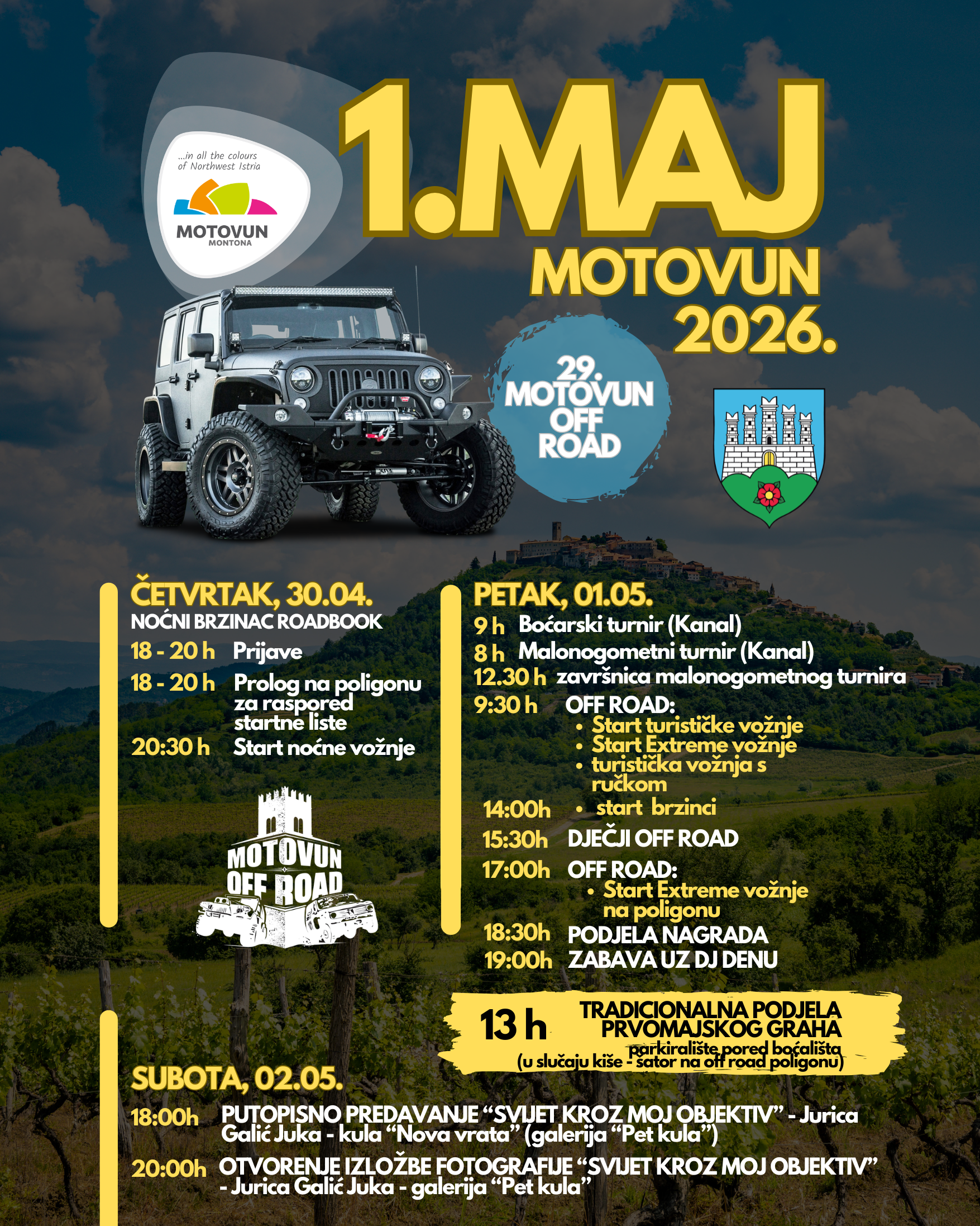 Tradicionalna manifestacija Motovun Off Road i ove će godine, 30. travnja i 1. svibnja, okupiti brojne natjecatelje, zaljubljenike u off road vožnju i posjetitelje iz cijele Istre i šire.